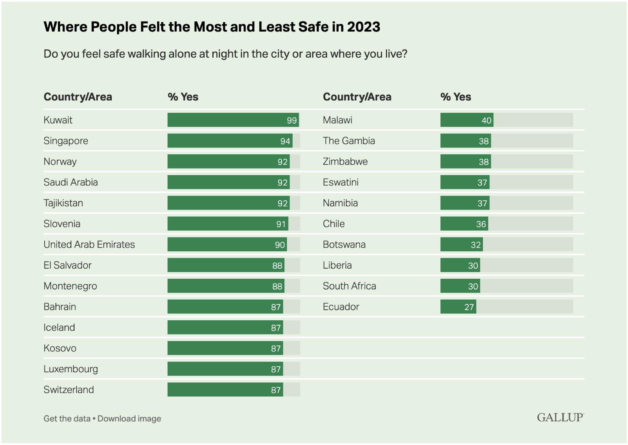 فوفقًا لتقرير الأمن العالميِّ السَّنويِّ ، يشعر 70 ? من النَّاس بالأمان عند المشي ليلاً - بمفردهم - . نعم ، سبعون بالمائة ! وهذا ارتفاع ملحوظ عن نسبة 64 ? المسجَّلة في عام 2013 . ربَّما علينا أن نعيد النَّظر في كلِّ تلك الأفلام الأمنيَّة الَّتي نشاهدها !